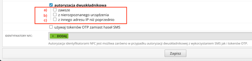 - W ustawieniach autoryzacji dwuskładnikowej zaznacz checkbox„ używaj tokenów OTP zamiast haseł SMS”.