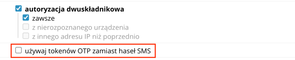 - W ustawieniach autoryzacji dwuskładnikowej zaznacz checkbox„ używaj tokenów OTP zamiast haseł SMS”.