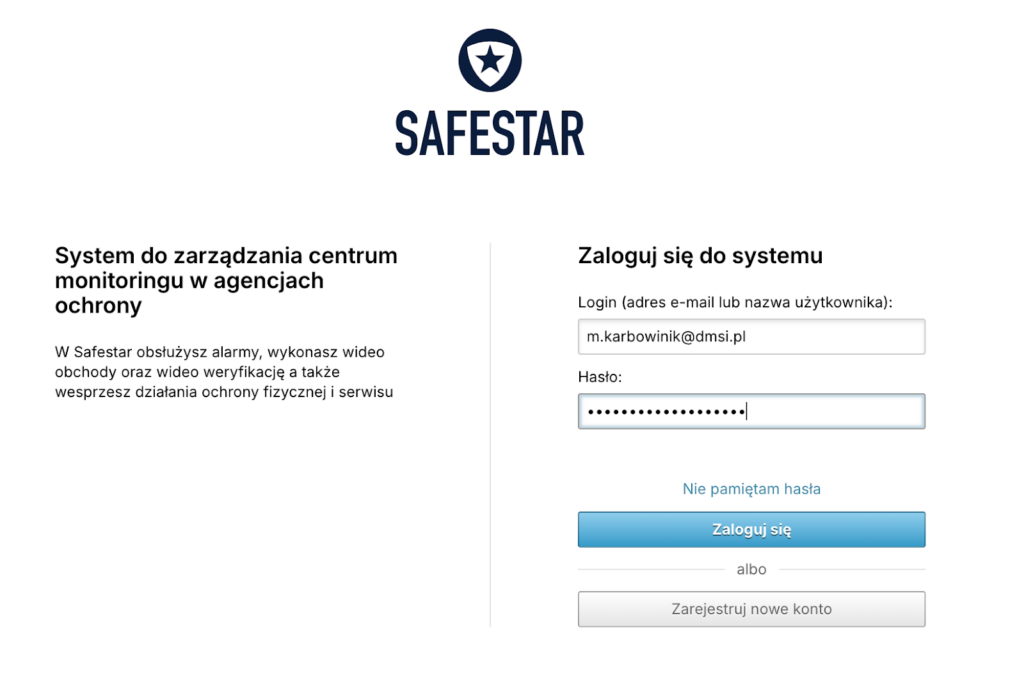 - Zaloguj się do systemu Safestar, wpisując prawidłowy login i hasło.