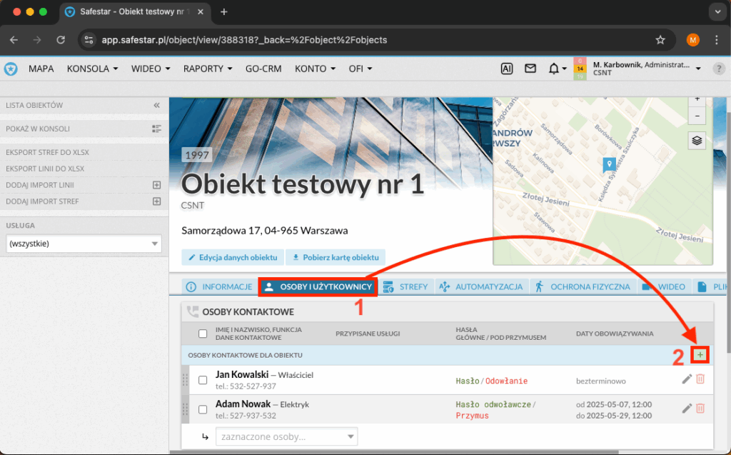 W celu uzupełnienia danych dotyczących osób kontaktowych na obiekcie, należy przejść do jego edycji, a następnie wybrać zakładkę Osoby i Użytkownicy. W celu dodania nowej osoby należy nacisnąć na przycisk „+” po prawej stronie listy.