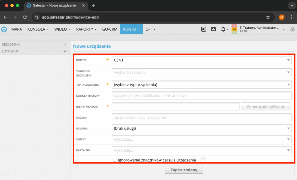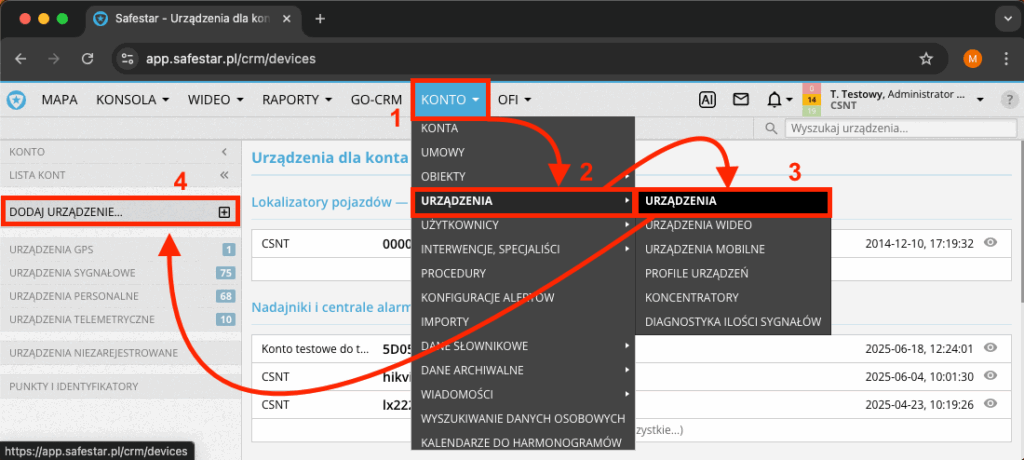 Aby w systemie Safestar poprawnie odbierać sygnały z urządzenia zainstalowanego w monitorowanym obiekcie należy dodać urządzenie. W tym celu wybieramy menu Konto -> Urządzenia -> Urządzenia. Następnie z menu, które pojawi się po lewej stronie widoku należy wybrać opcję Dodaj urządzenie.