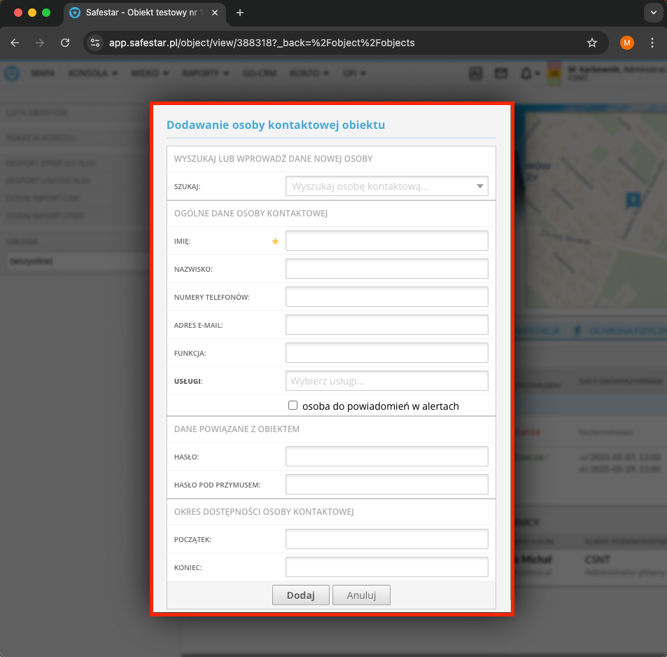 - początek i koniec – okres obowiązywania osoby kontaktowej na obiekcie.