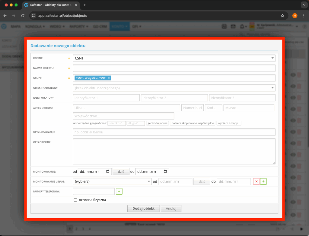 WAŻNA INFORMACJA! Dodatkowo warto uzupełnić datę początku monitorowania oraz adres obiektu podając podstawowe dane ulice i miasto. Na podstawie tych informacji systemowych, opisujących współrzędne GPS, możliwe jest uruchomienie lokalizacji obiektów na mapach w systemie
