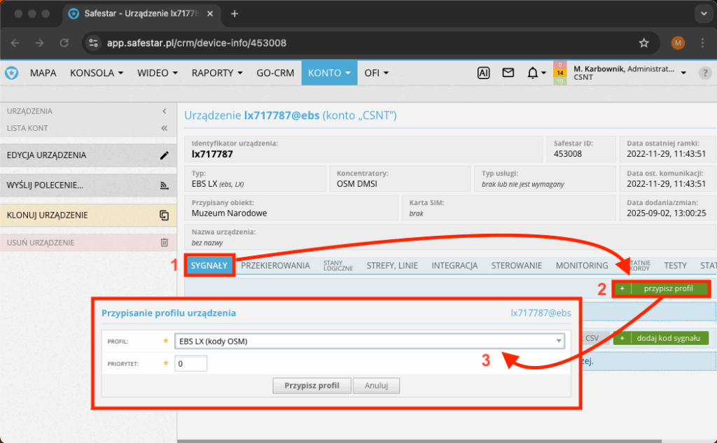 W celu przypisania odpowiedniego profilu należy w zakładce Sygnały wybrać opcję przypisz profil (po prawej stronie), następnie w formularzu trzeba wybrać odpowiedni dla nadajnika profil sygnałów i zatwierdzić przyciskiem przypisz profil. Od tego momentu wszystkie odebrane przez Safestar sygnały będą przetwarzane przez szablon i będą generowały odpowiednie zdarzenia na konsoli systemu.