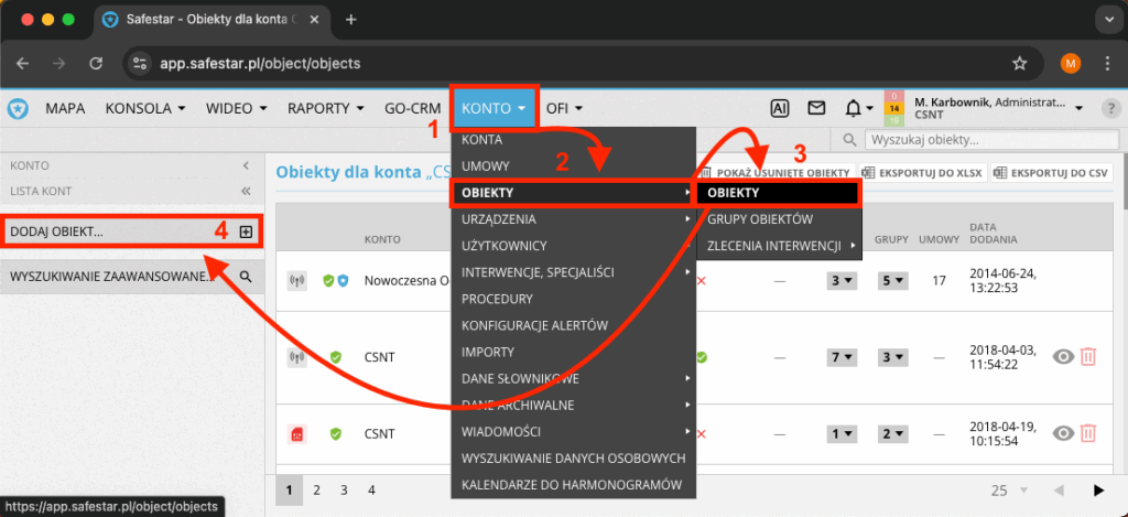 Aby można było monitorować zdarzenia w systemie Safestar, należy w pierwszej kolejności utworzyć obiektu. W tym celu wybieramy moduł Konto -> Obiekty-> Obiekt , następnie z menu po lewej stronie, opcję Dodaj obiekt.