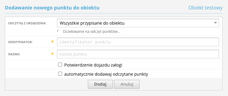 Należy wybrać urządzenie, z którego będą odczytywane poszczególne punkty, a następnie zeskanować (odbić) jeden z nich. Po pomyślnym odczycie sygnału z urządzenia, system automatycznie wypełni pole „Identyfikator” jego numerem seryjnym. Następnie należy nadać punktowi nazwę i zatwierdzić, klikając „Dodaj”.
