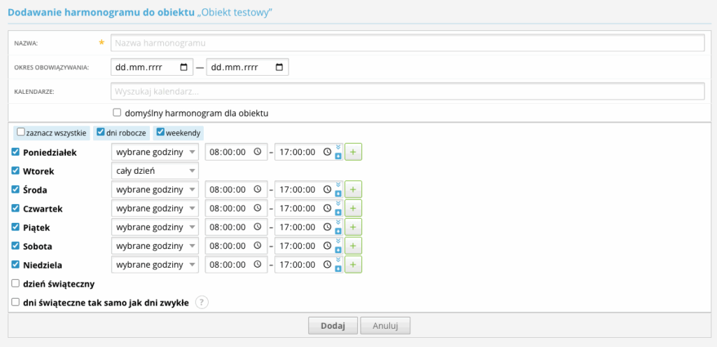 W formularzu należy podać nazwę harmonogramu oraz wybrać odpowiednie dni i godziny jego obowiązywania. Następnie zatwierdzić wprowadzoną konfigurację, klikając „Dodaj”.