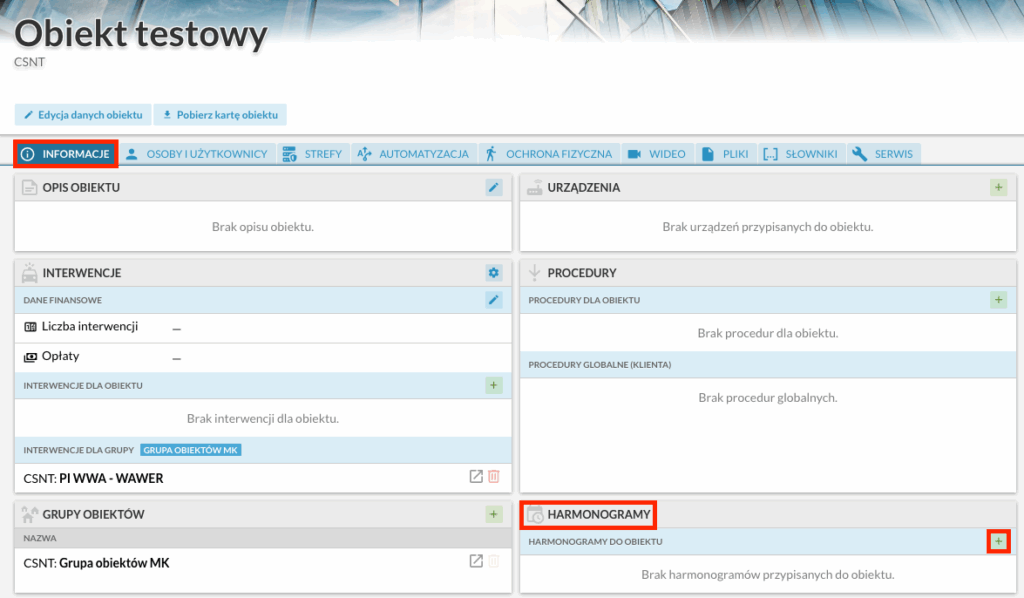 Konfiguracja harmonogramów jest realizowana z poziomu zakładki “Informacje” w kontekście danego obiektu.