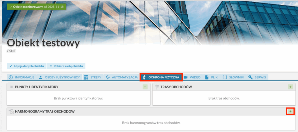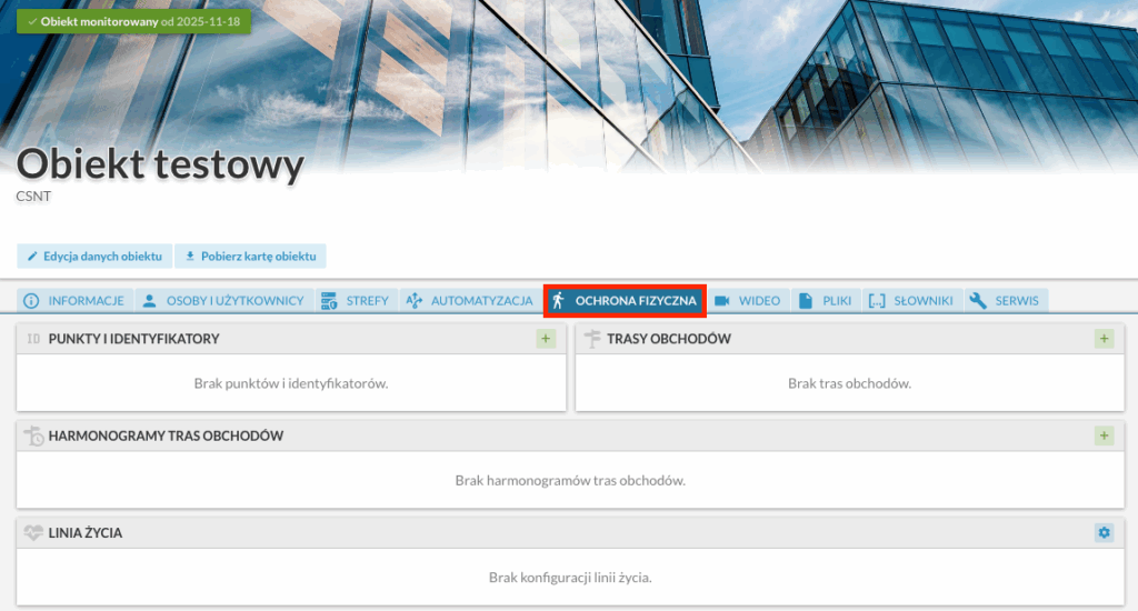 Konfiguracja obchodów jest realizowana z poziomu zakładki “Ochrona fizyczna” w kontekście danego obiektu.